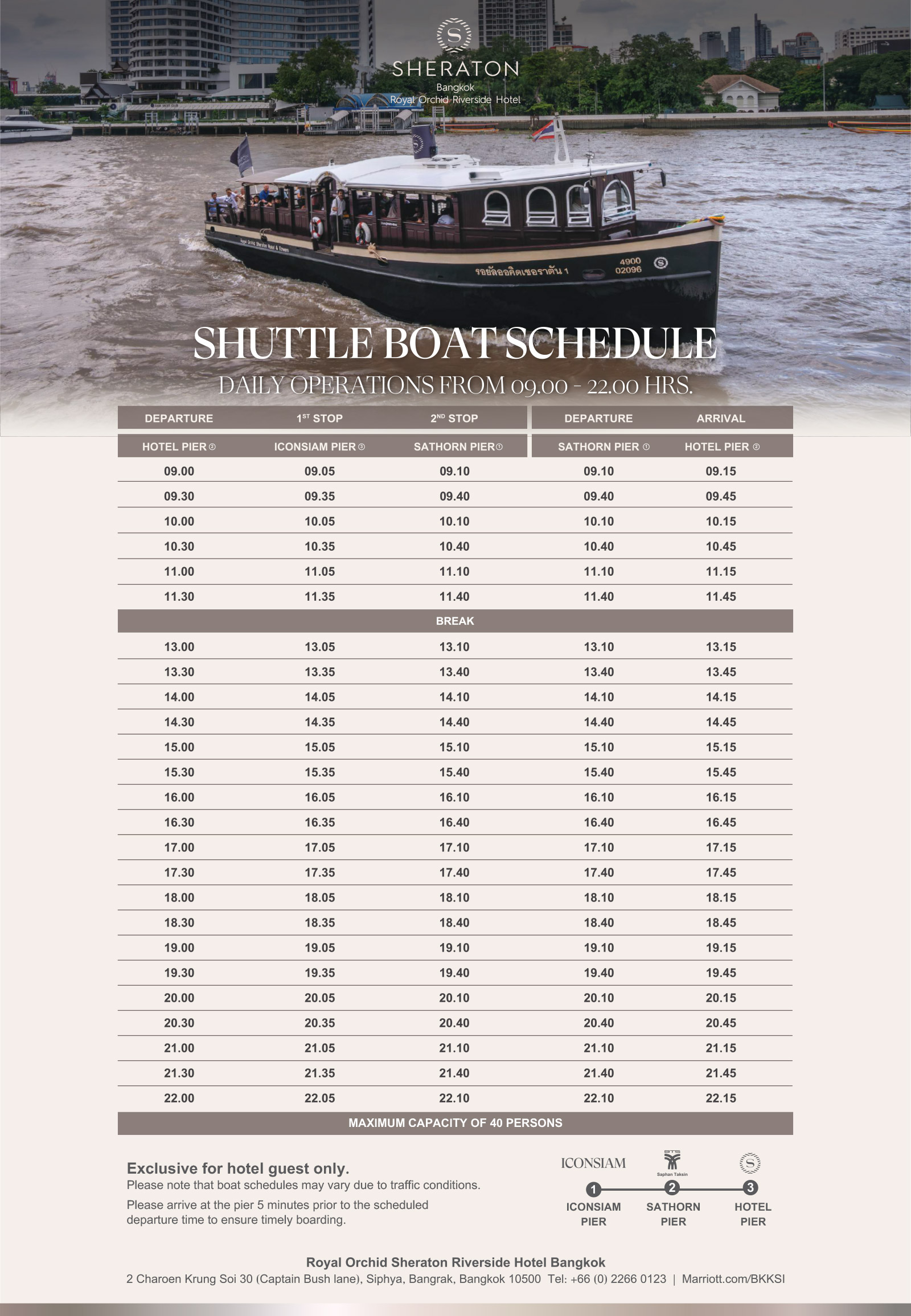 The express train will take you directly to Phayatai Station (N2), where you can connect to the Skytrain (BTS Sukhumvit Line: N2 to Siam (Cen) drop off at Siam (Cen) then take the Silom Line to Saphan Taksin (S6) / Sathorn Pier and take a cab to the Royal Orchid Sheraton Riverside Hotel, Bangkok or take the hotel Shuttle Boat as schedule has been shown below.